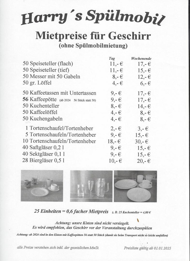Bei uns können Sie weißes Arcopal-Geschirr (Hartglas) und das dazugehörige Besteck (Messer, Gabeln, Löffel usw) mieten, sowie Saft-, Bier- und Sektgläser. Unsere Sachen sind zu je 50 (bzw. 40 oder 28 Stück bei den Gläsern) gepackt, sodaß sie schön in einem Kofferraum verstaut werden können. Falls Sie möchten, haben wir auch begehbare und nicht begehbare PKW-Anhaenger, die mit Winterhalterspuelmaschinen ausgestattet sind. Natuerlich sind da ein Vorspuelbecken und (wenn Sie möchten) Geschirr auch dabei.