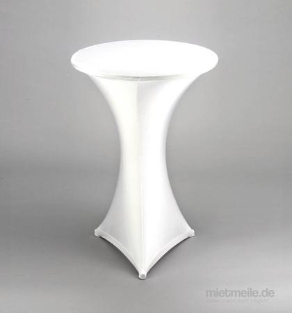 Stretchhusse oder Husse mit Band für Stehtische mit Ø=70 - 80 cm Farben weiß / schwarz / Holzdesign. Für Messen, Firmenevents, Privatfeiern, Hochzeiten, Stehempfang.