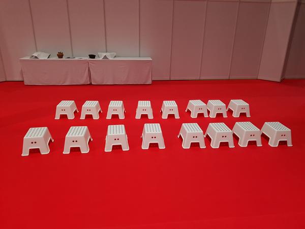 Bei diesem Spiel, steht jeder Teilnehmer auf einem Hocker. Ziel ist es den letzten Hocker von hinten nach vorne zu reichen. Geschicklichkeit und Gleichgewichtsinn sind hier gefragt. Bodenkontakt mit den Füßen ist tabu.