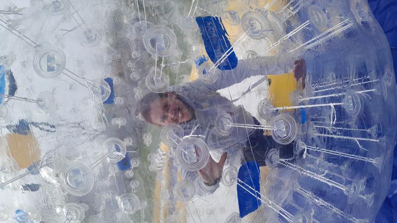 Zwei Personen laufen in je einer 2 m großen, aufgeblasenen, doppelwandigen Ball um die Wette durch den 20 m x 10 m große Arena. Einen lustigen Run der auch den Zuschauern Spaß macht.