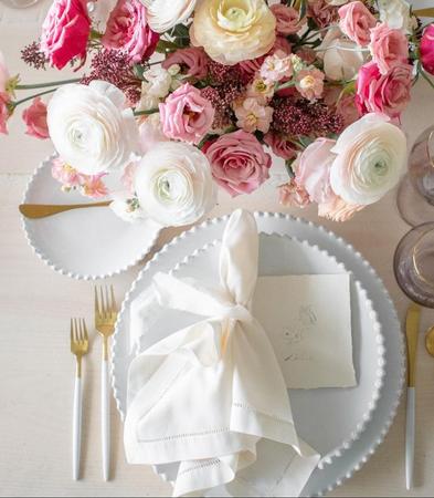 Platzteller mieten, weiße Porzellan Teller Perlen Verleih Bielefeld Hochzeitsdekoration Deko