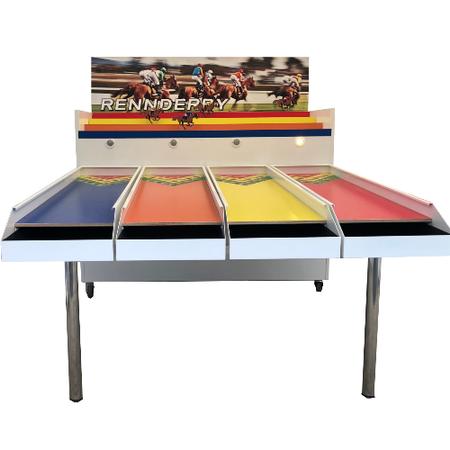 Beim Pferdederby mit 4 Bahnen erleben bis zu vier Teilnehmer gleichzeitig ein spannendes Wettrennen voller Geschick und Tempo. Ziel des Spiels ist es, das eigene Pferd möglichst schnell ins Ziel zu bringen. Dazu werden die Spielbälle über die Spielfläche gerollt und gezielt in die vorgesehenen Löcher befördert. Jeder erfolgreiche Treffer sorgt dafür, dass sich das jeweilige Pferd ein Stück nach vorne bewegt. Präzision, Konzentration und ein gutes Timing entscheiden über den Sieg. Das Pferdederby begeistert durch sein leicht verständliches Spielprinzip und sorgt sofort für Wettkampfstimmung bei Spielern und Zuschauern. Dank der vier parallelen Bahnen entsteht ein dynamisches Renngefühl, das sowohl Kinder als auch Erwachsene mitreißt. Das Modul eignet sich ideal für Firmenfeiern, Stadt- und Vereinsfeste, Messen oder Familienevents und ist ein echter Publikumsmagnet. Durch die einfache Handhabung und die hohe Spielgeschwindigkeit können viele Teilnehmer nacheinander spielen, was für anhaltende Action und Spaß auf jeder Veranstaltung sorgt. Technische Anforderungen - Technische Maße: L 2,6 m x B 2,0 m x H 2,0 m